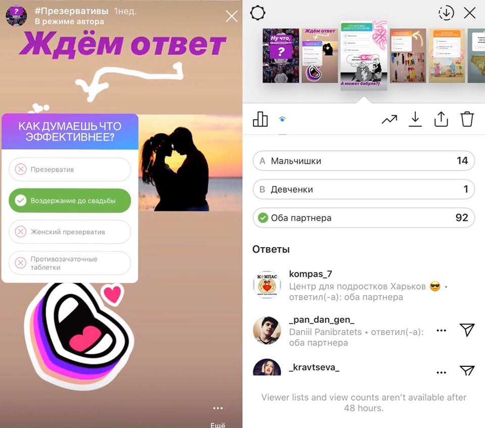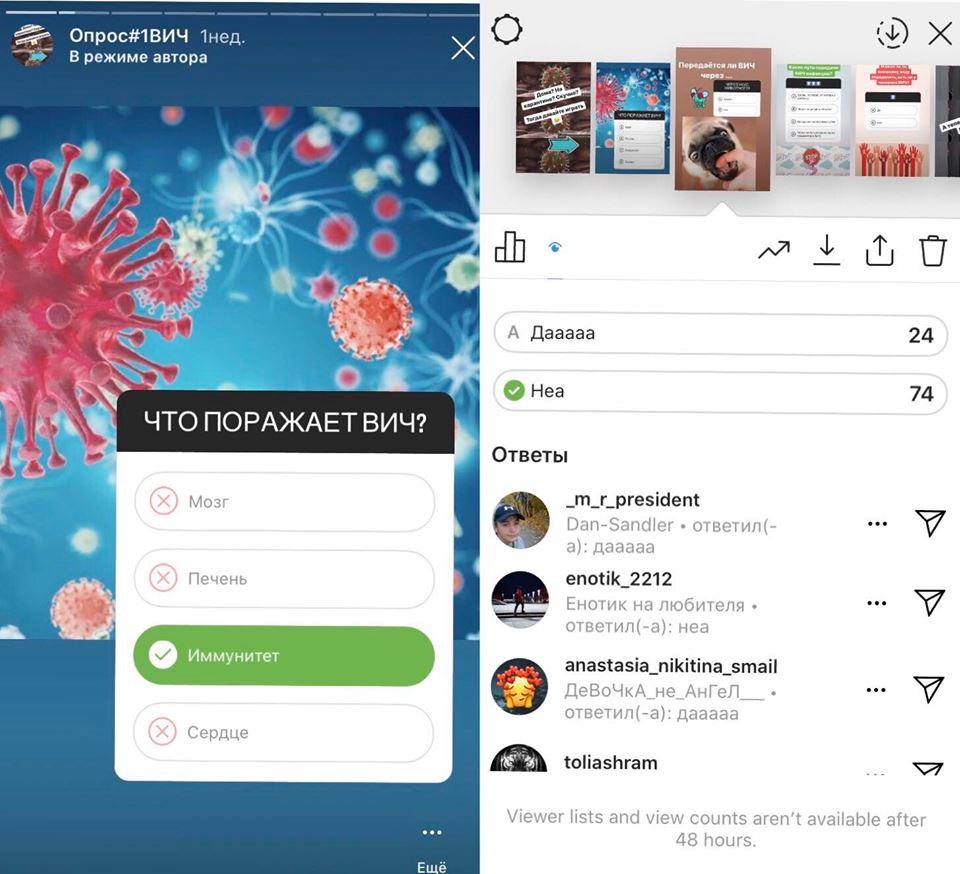 In addition, we plan to contact those visitors of our Instagram page who gave wrong answers to the quiz questions (e.g. about HIV infection or about condom use) in order to analyze their knowledge, belonging to a risk group and to involve them in the project services.
